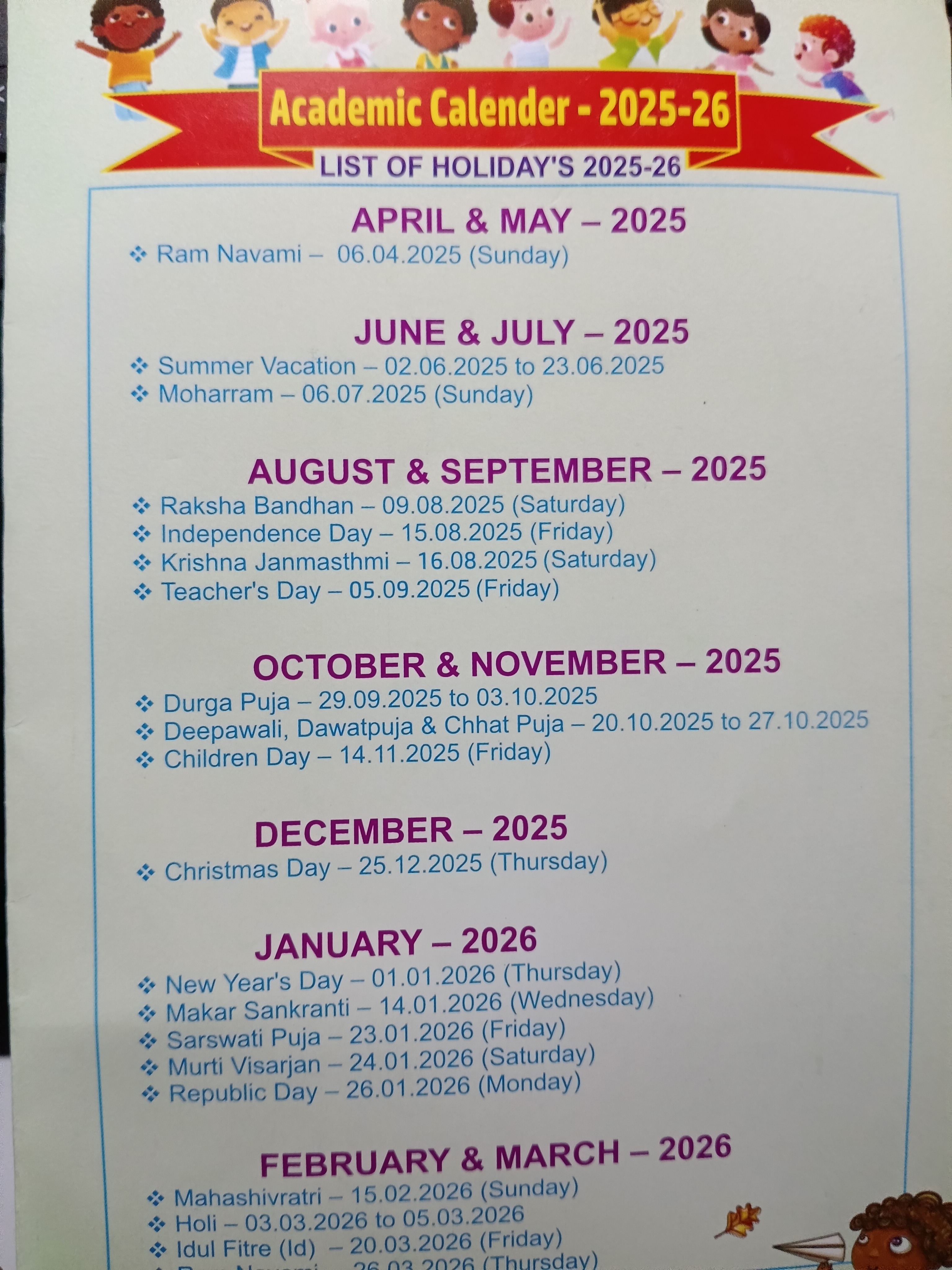 Saraswati Puja is celebrated with devotion and joy, honoring the goddess of wisdom and learning. Students and teachers offer prayers, flowers, and traditional rituals. The atmosphere is filled with music, cultural performances, and vibrant decorations. This celebration inspires reverence for knowledge, encourages artistic expression, and strengthens cultural values among young learners.